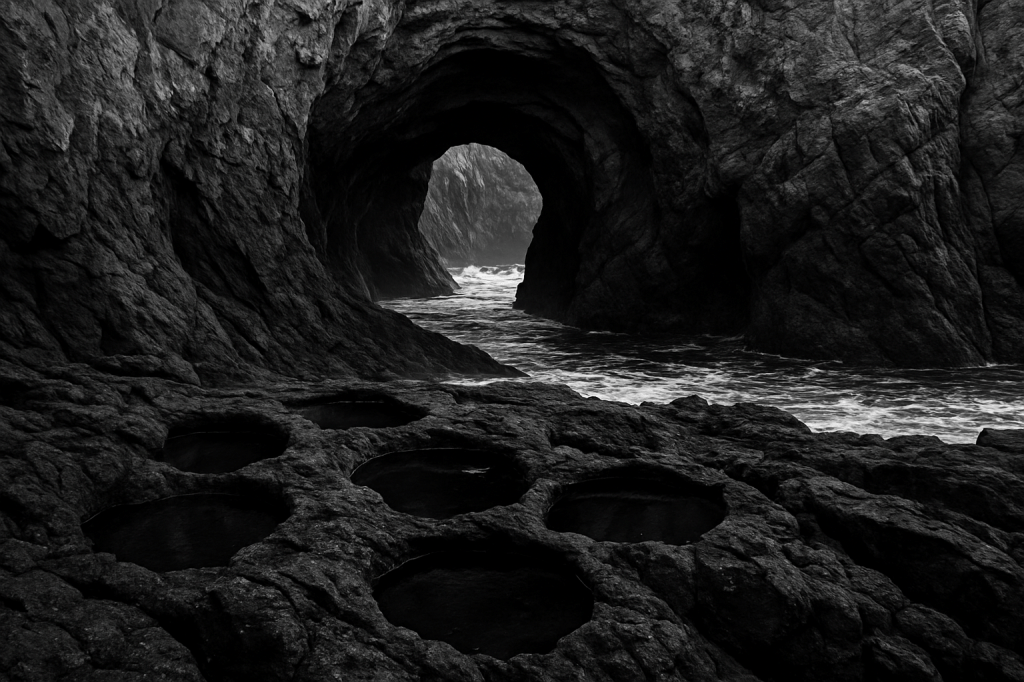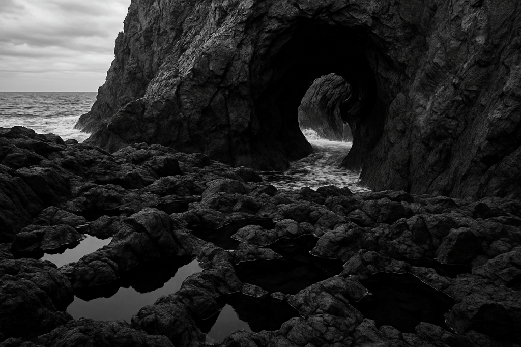 The cave exhales, and the tide surges, as if the sea itself tries to climb into the mouth.